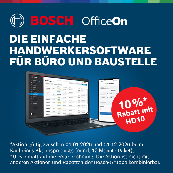 OfficeOn von Bosch ist eine einfache und übersichtliche Handwerkersoftware für Büro und Baustelle, mit der die Arbeitsabläufe eines Handwerksbetriebs beschleunigt und digitalisiert werden können. Durch die zentrale Verwaltung aller Schlüsselprozesse im Unternehmen können Aufgaben wie die Angebots- und Rechnungserstellung, Einsatzplanung, Baustellendokumentation und Zeiterfassung einfacher und schneller erledigt werden. Cloudbasiert und ohne Installation direkt verfügbar, werden die Daten in Echtzeit synchronisiert und der Zugriff ist jederzeit standort- und geräteunabhängig möglich – egal, ob über die Web-Anwendung fürs Büro oder die Mobil-App für die Mitarbeiter auf der Baustelle. Schnittstellen wie Datanorm und IDS ermöglichen die schnelle Integration von Material- und Leistungspositionen von Großhändlern und über den DATEV-Export können Rechnungsdaten direkt an den Steuerberater oder das Finanzamt übermittelt werden. Buchen Sie jetzt eine kostenlose Demo! |